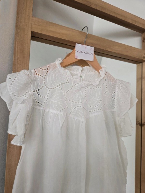 Blusa musculosa de lino con detalle de broderie en el escote, cuello medio y volados en los hombros.
