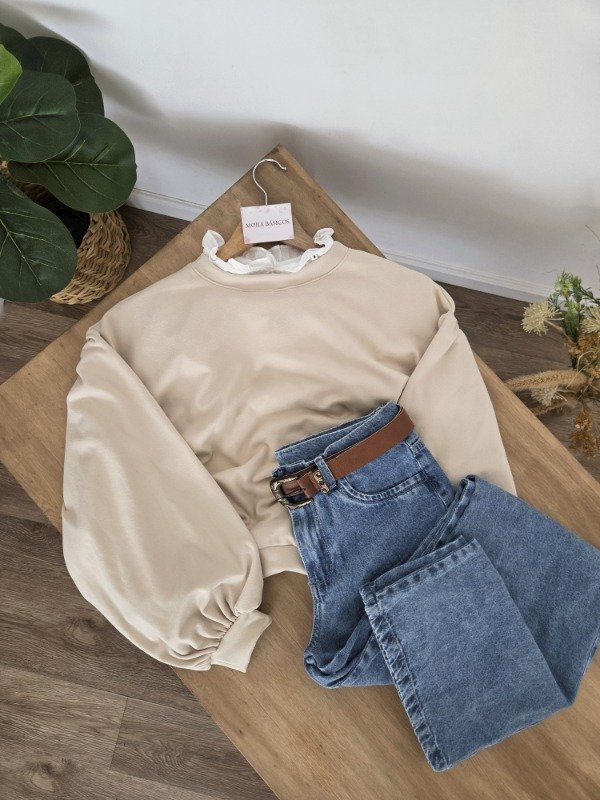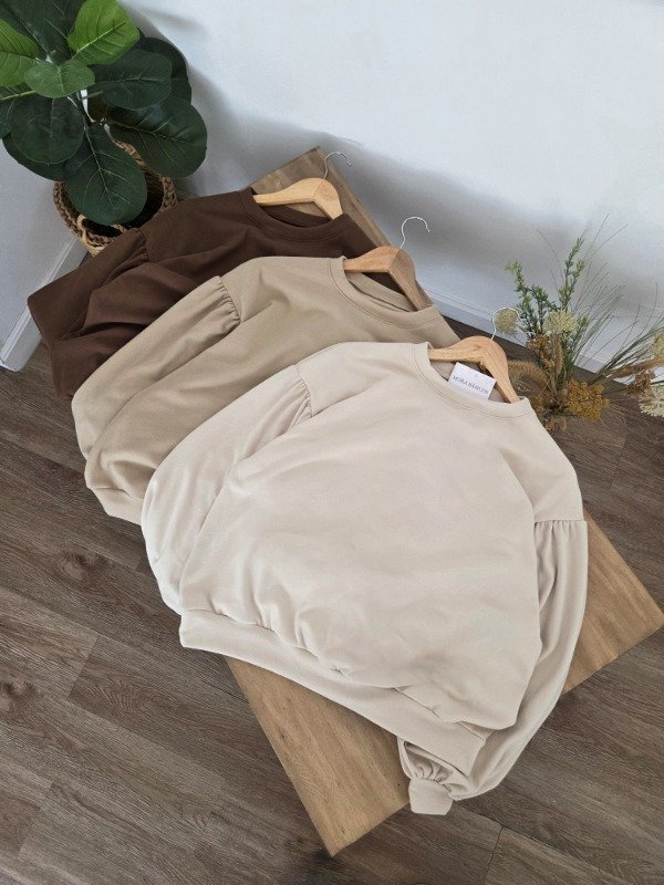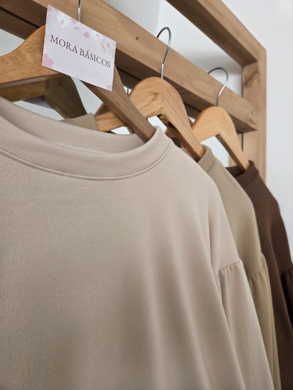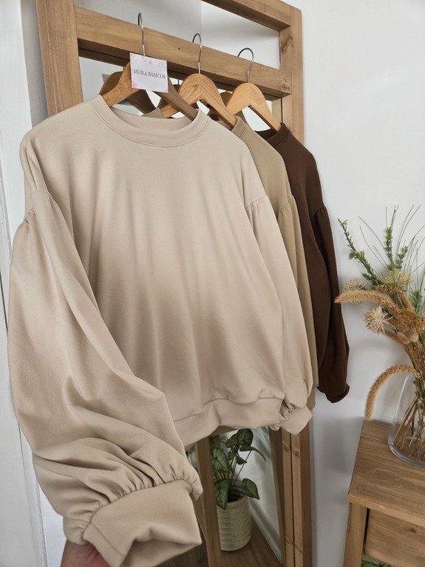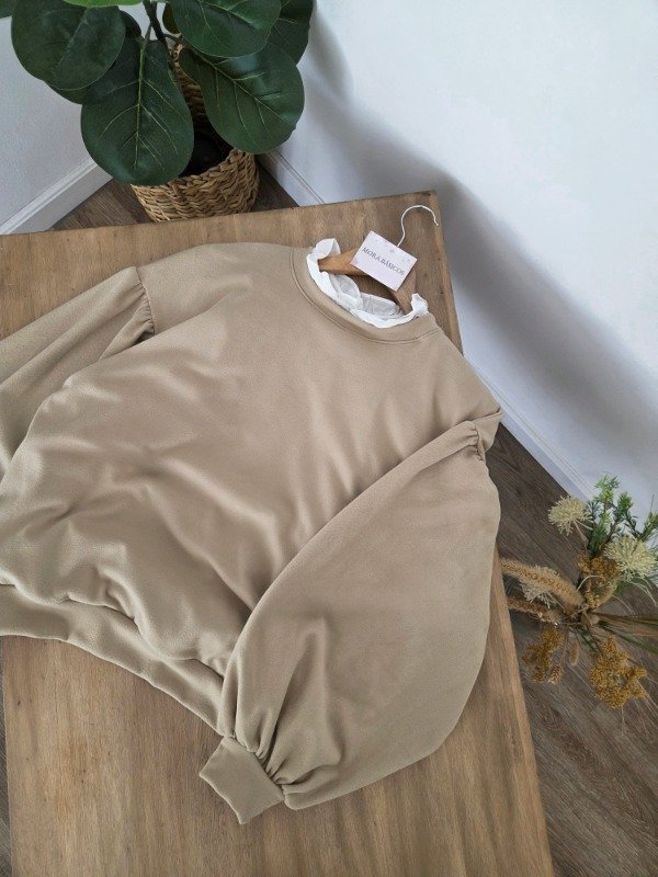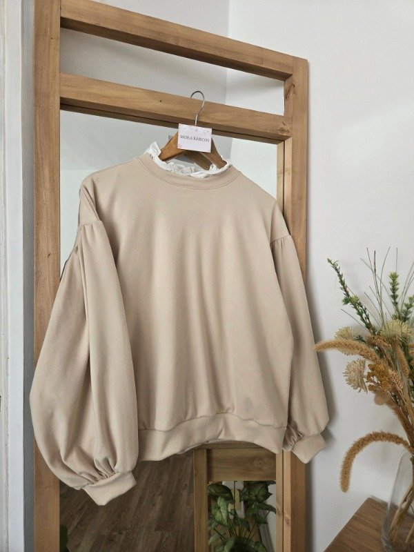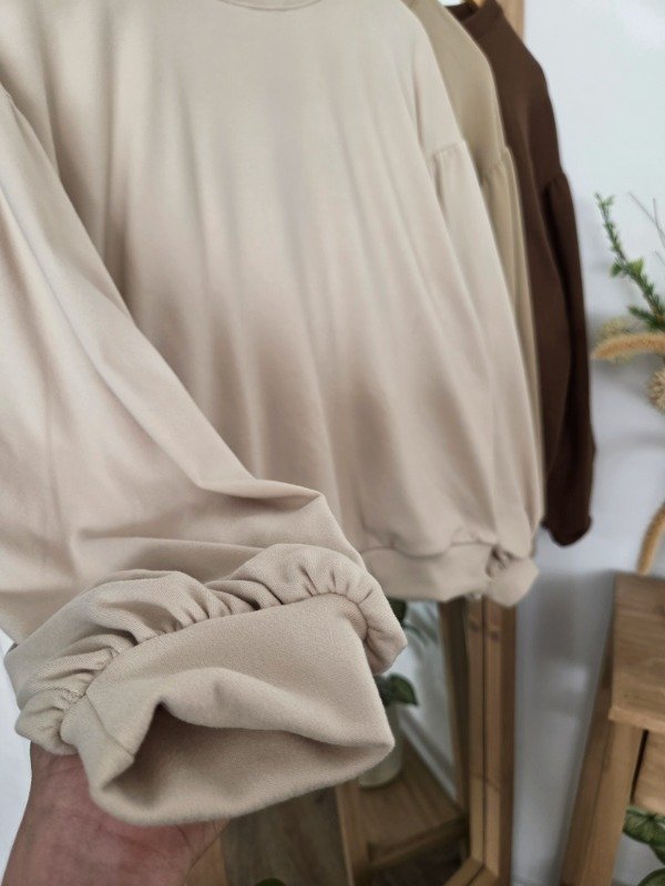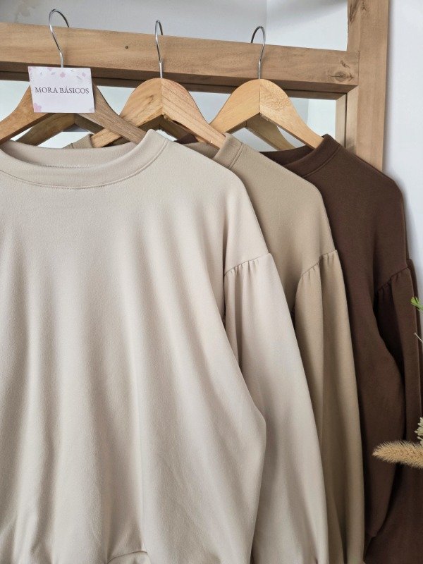 Buzo amplio estilo oversize con mangas globo y cuello redondo. Confección en darlon (símil polar).