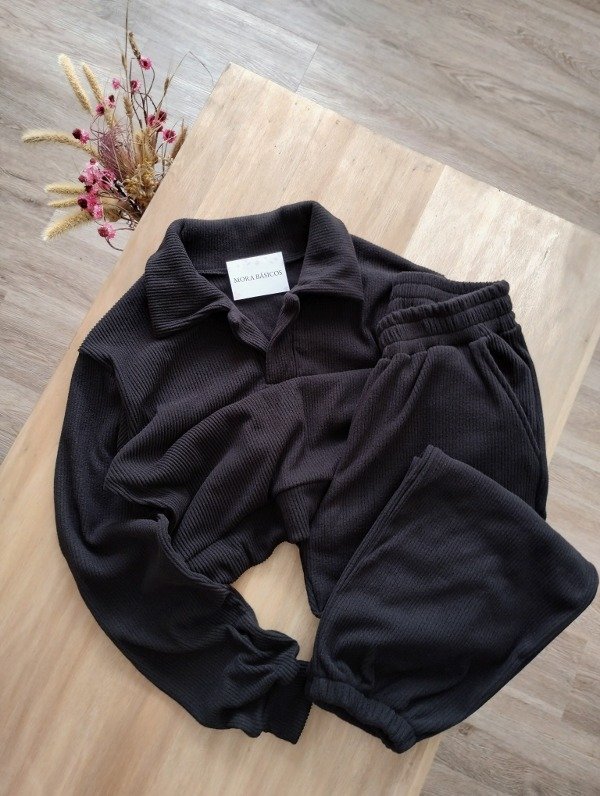 Conjunto de buzo con cuello chomba y ajuste en puños y cadera, con pantalón jogging tiro alto con cintura elástica. Confección en morley lanilla brush.