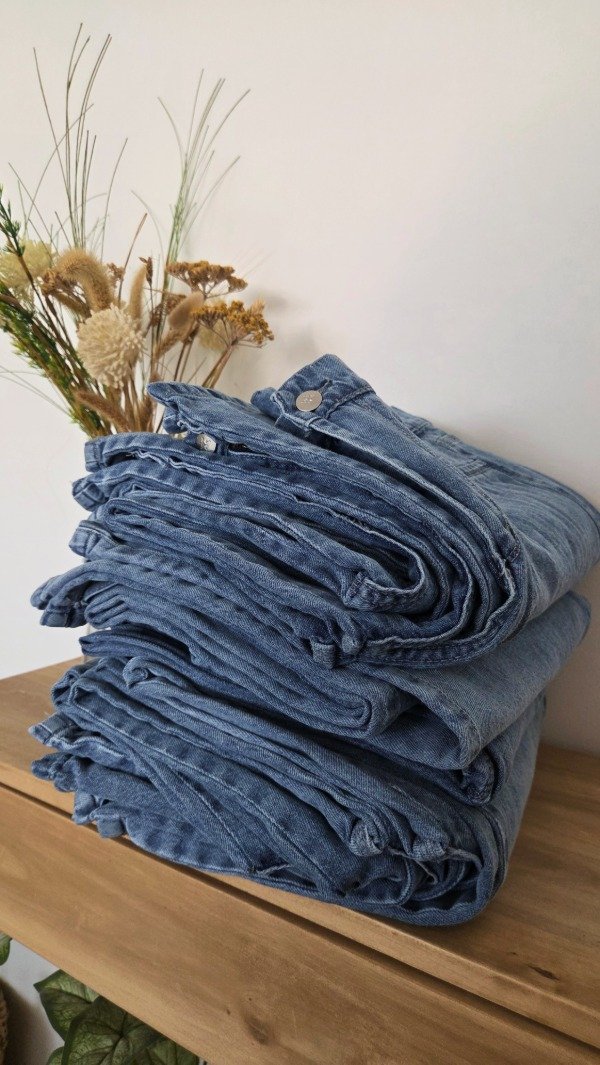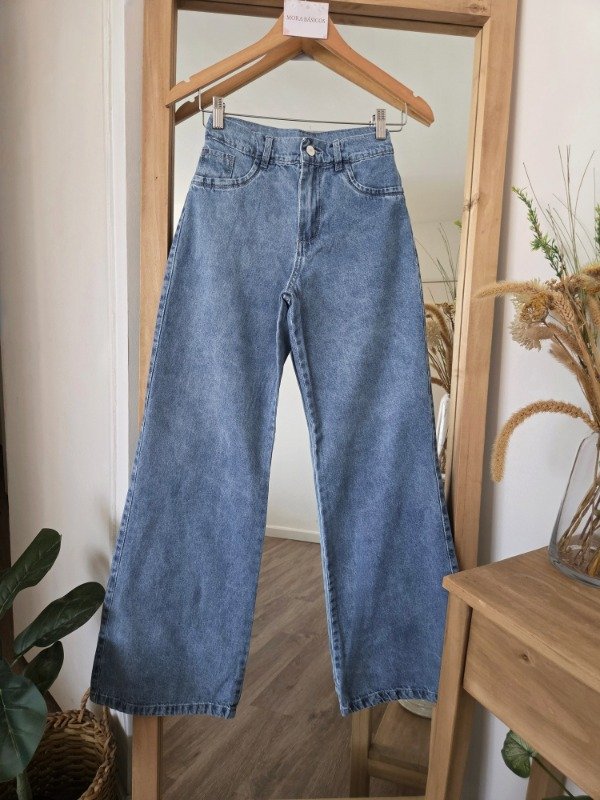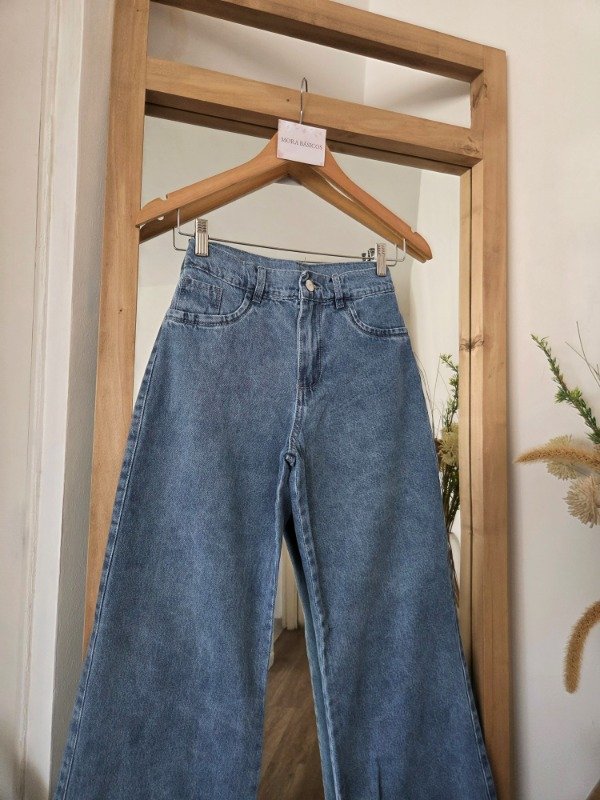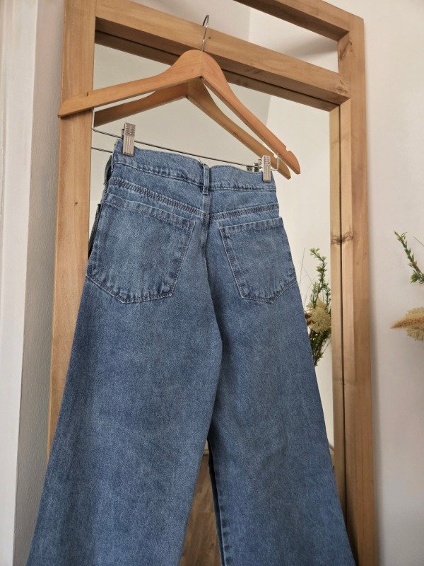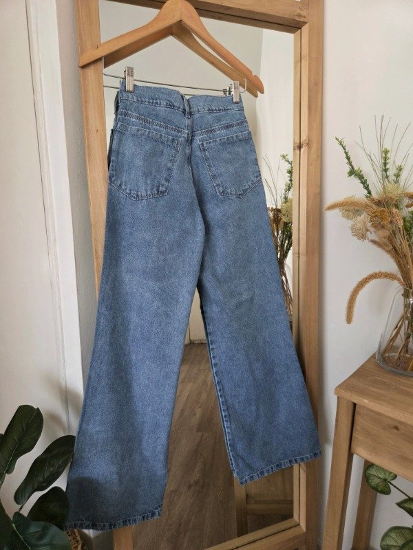 Jean wide leg tiro alto rígido con bolsillos delanteros y frontales.