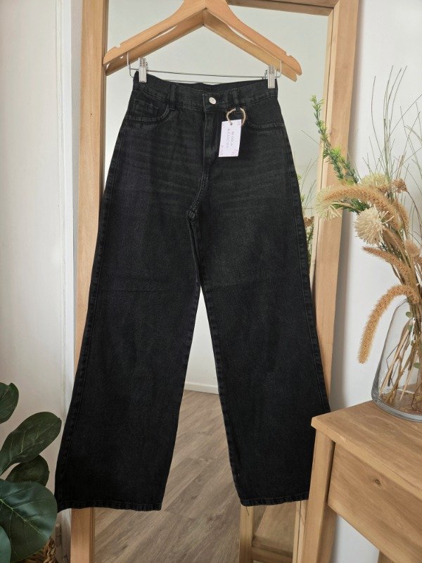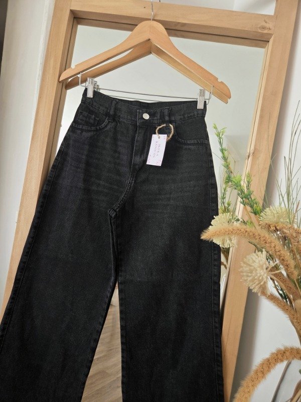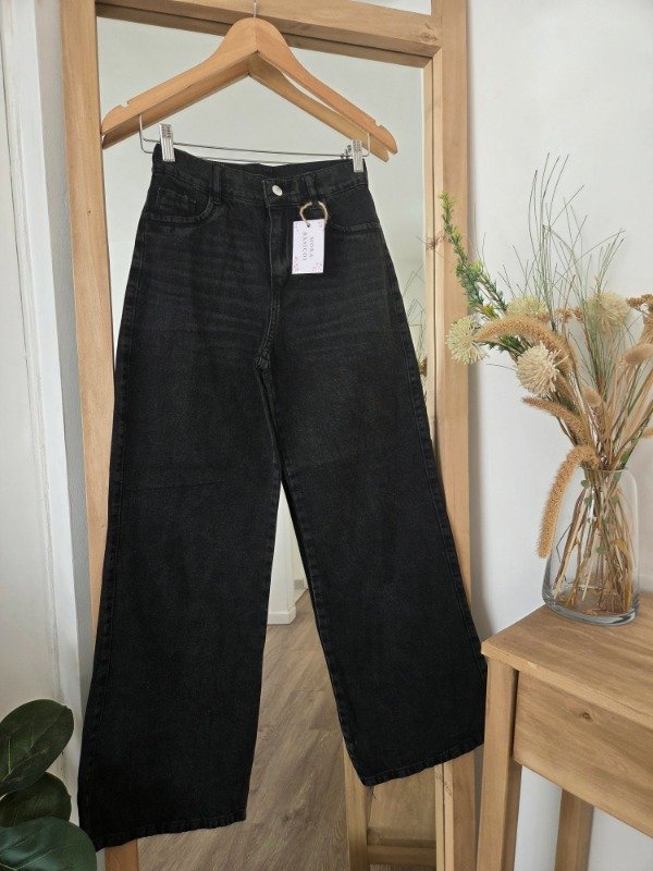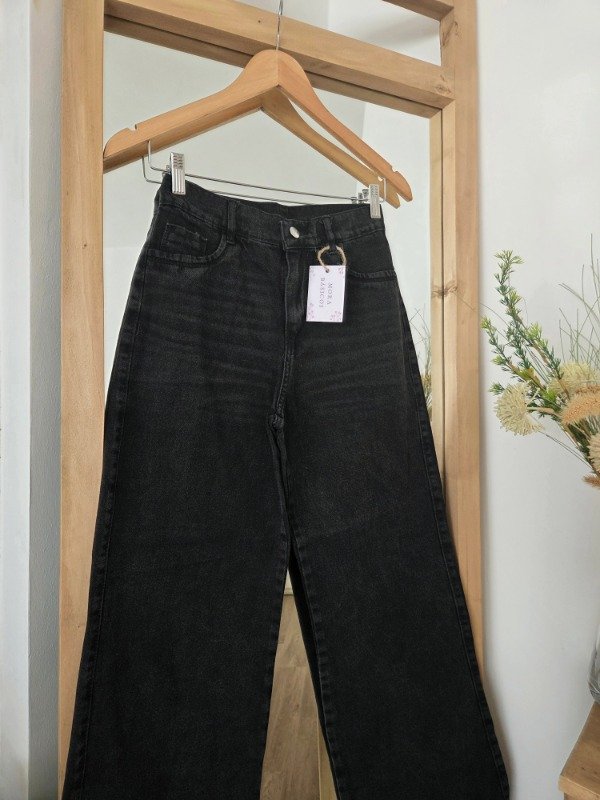 Jean wide leg tiro alto rígido con bolsillos delanteros y frontales.