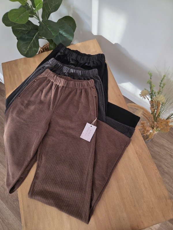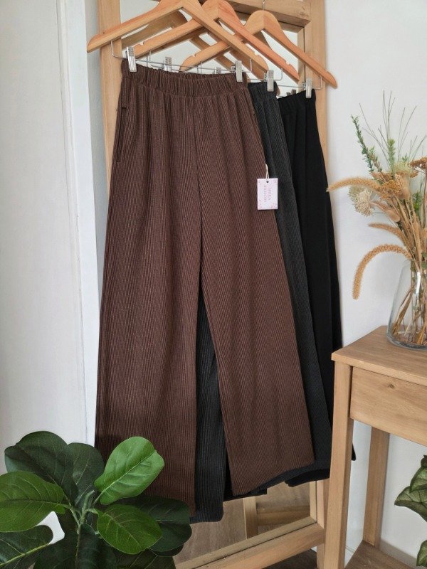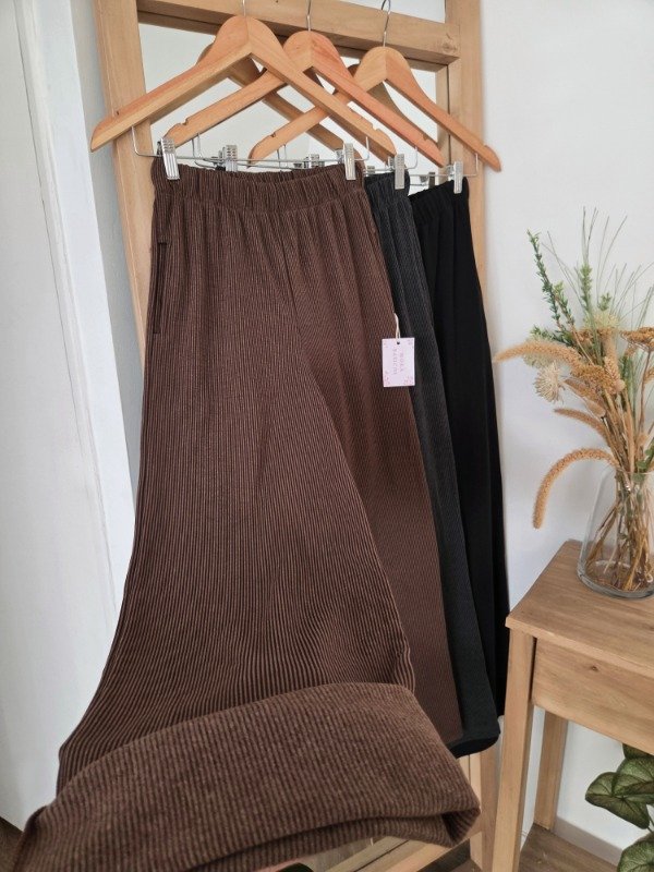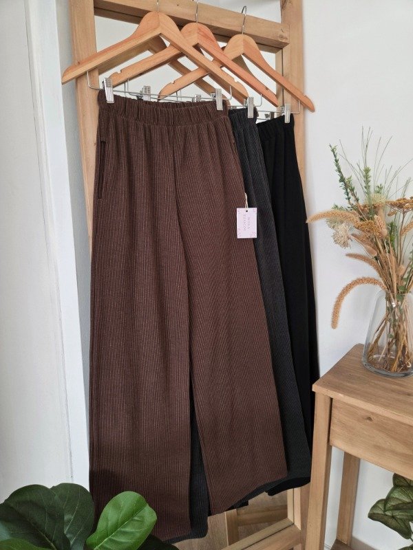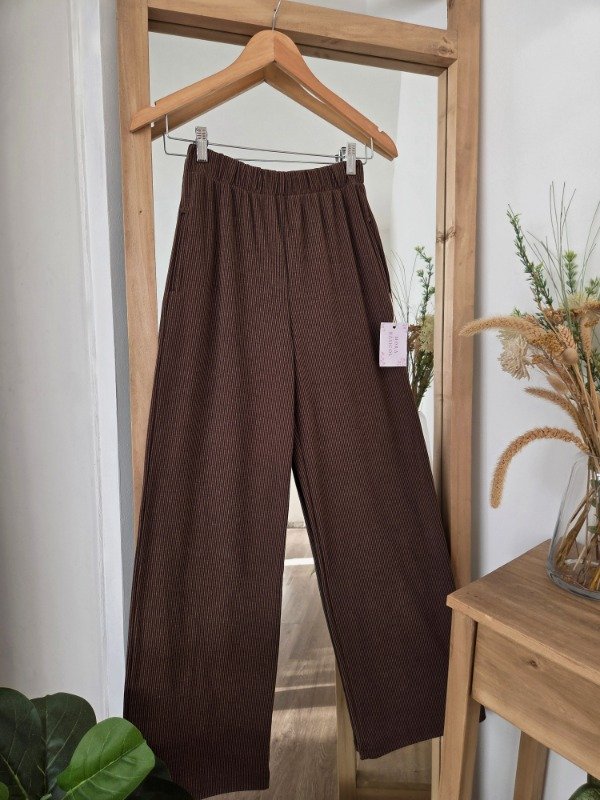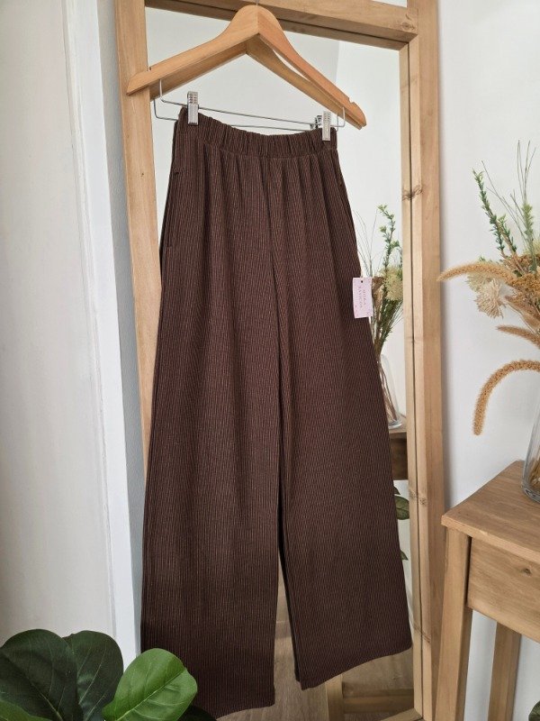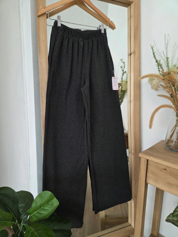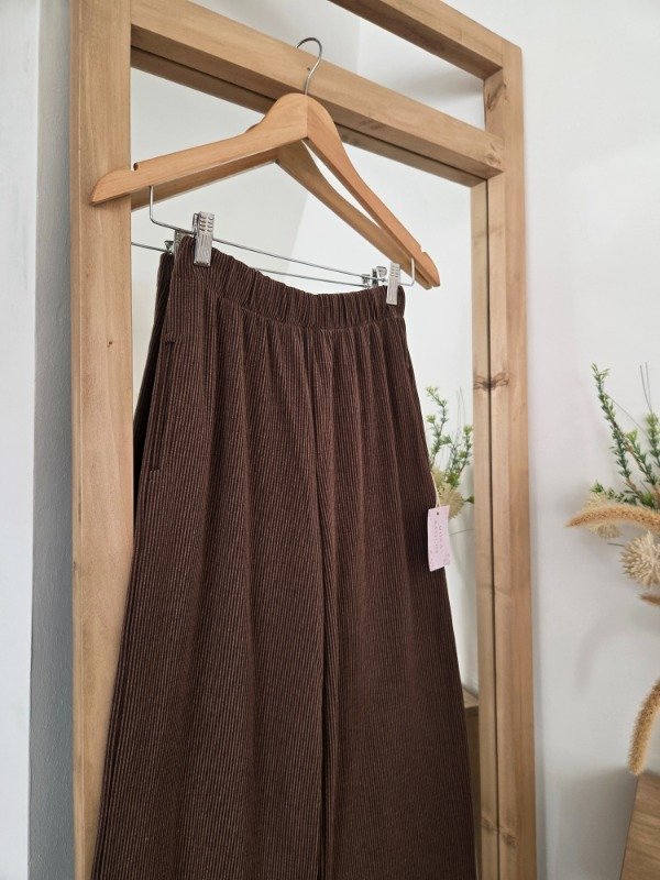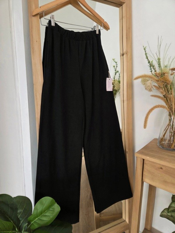 Pantalón palazzo de tiro alto confeccionado en morley soft por fuera, por dentro cuenta con friza suave. De calce relajado y pierna amplia, con cintura elastizada que se adapta al cuerpo.