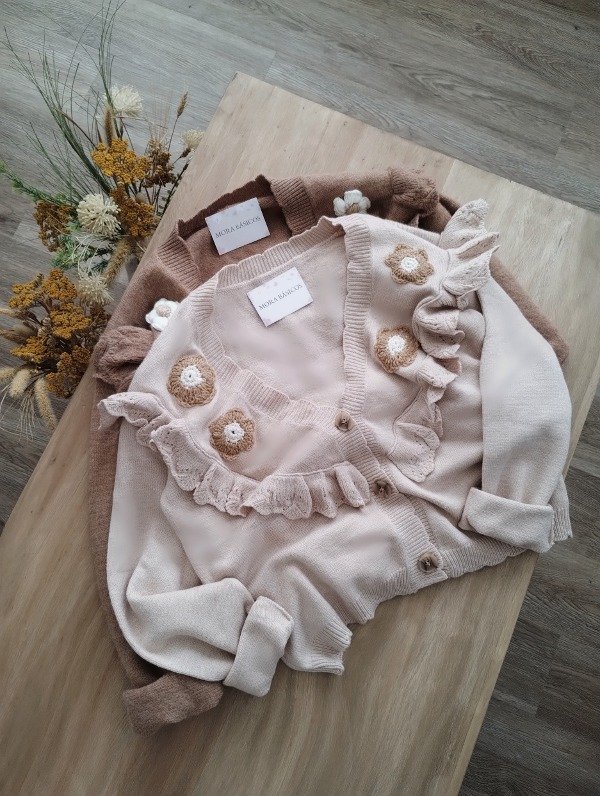 Cardigan de doble bremer con detalle de volados y flores bordadas en lana. Caída amplia.