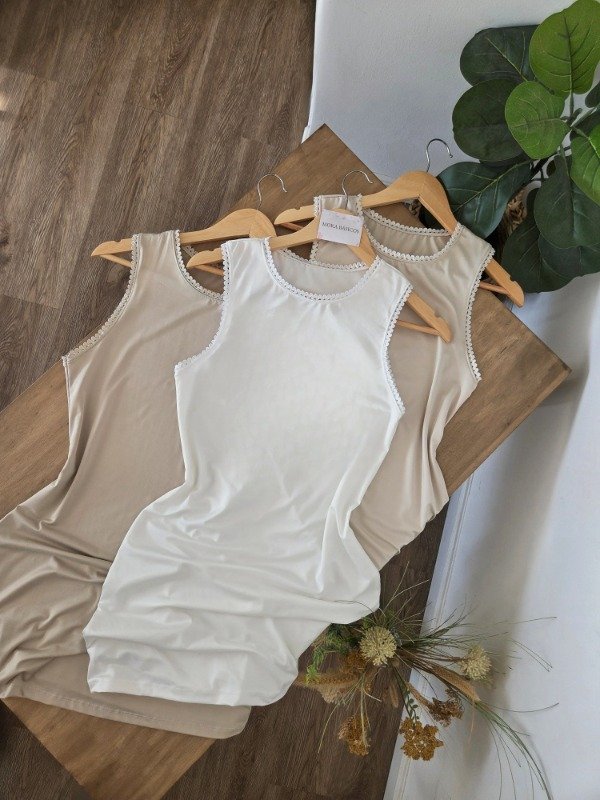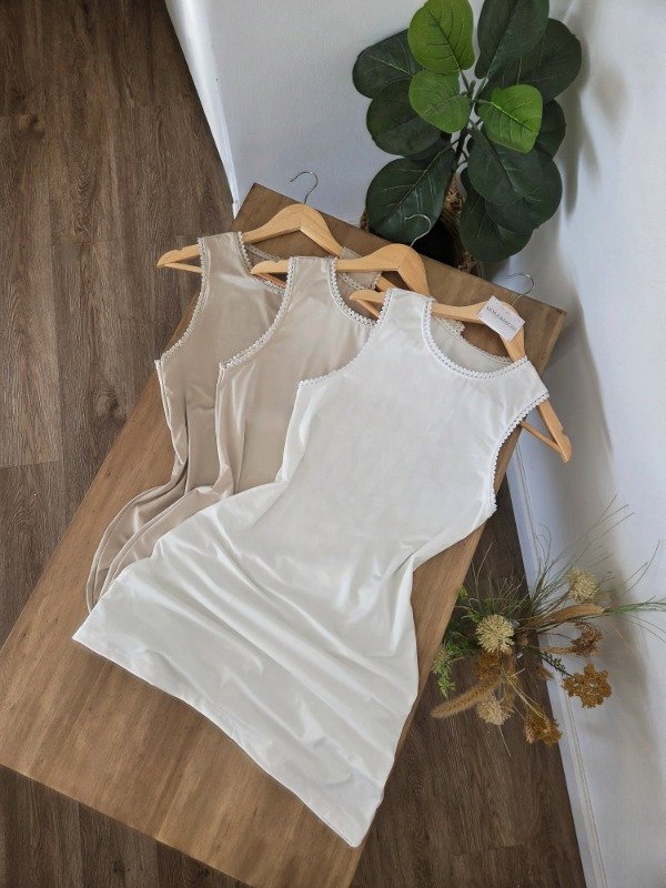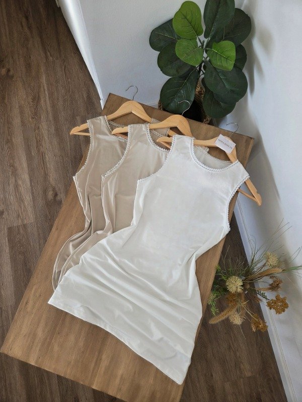 Vestido musculosa de microfibra con detalle de puntilla en bordes.