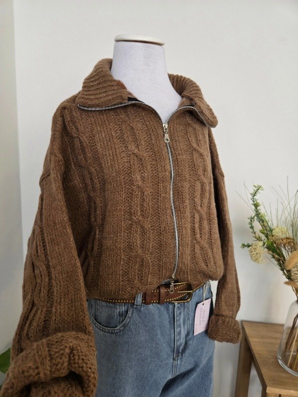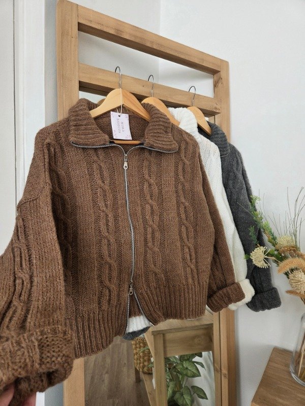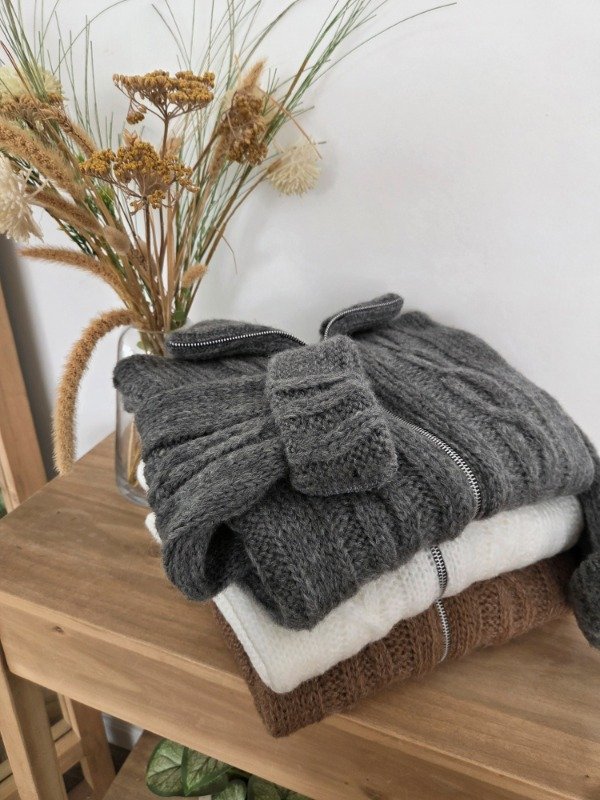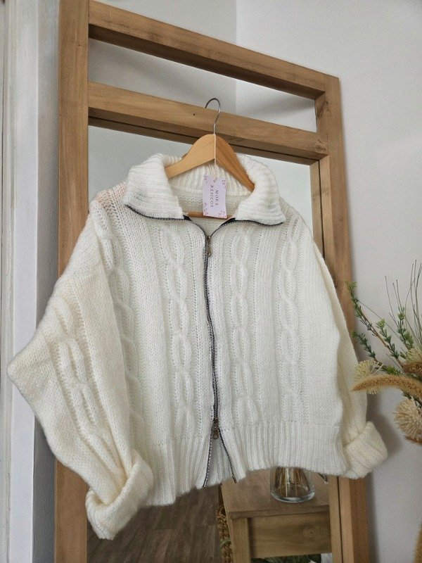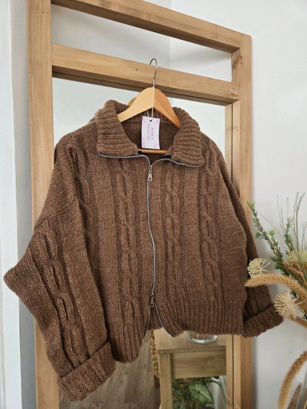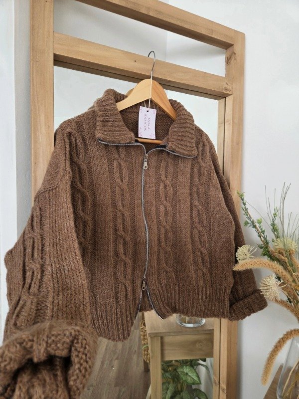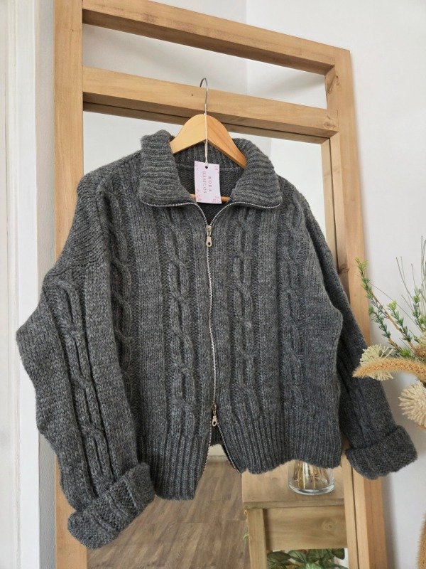 Campera tejida de lana, suave y abrigada, con calce relajado y diseño trenzado. Cuenta con doble cierre frontal y cuello amplio, ideal para usar abierto o cerrado.