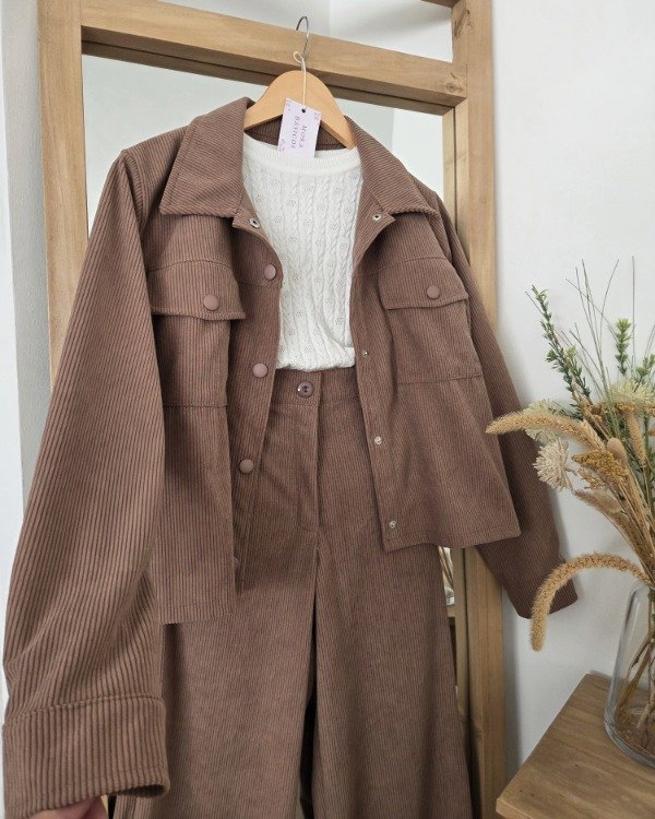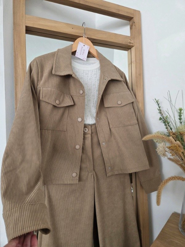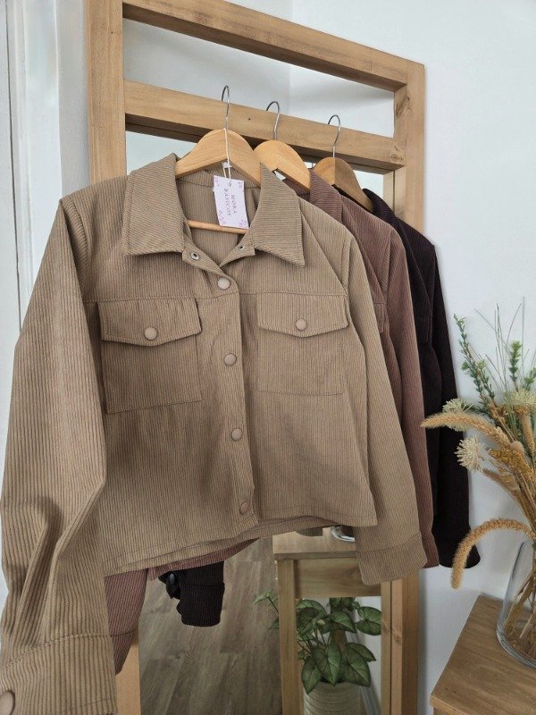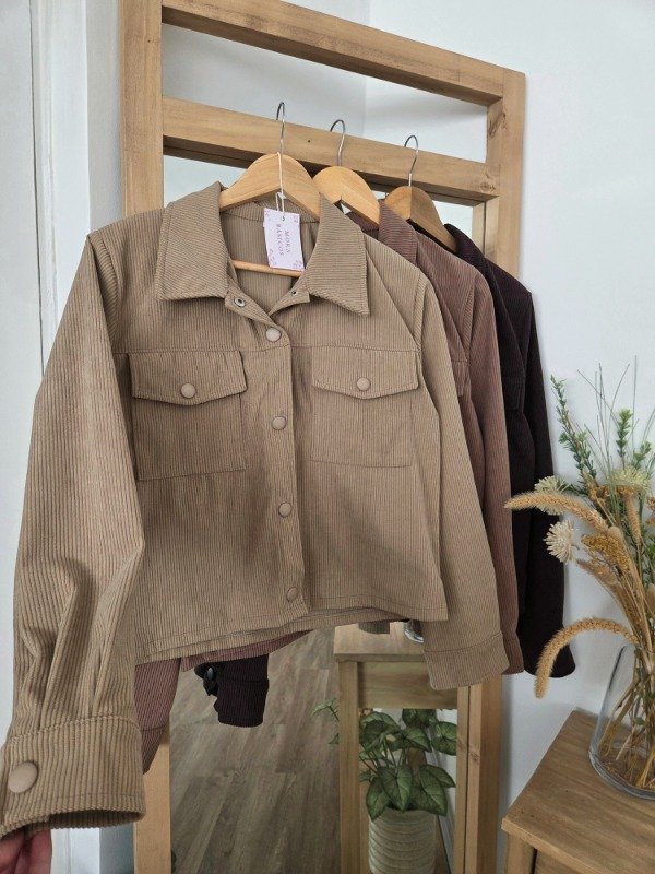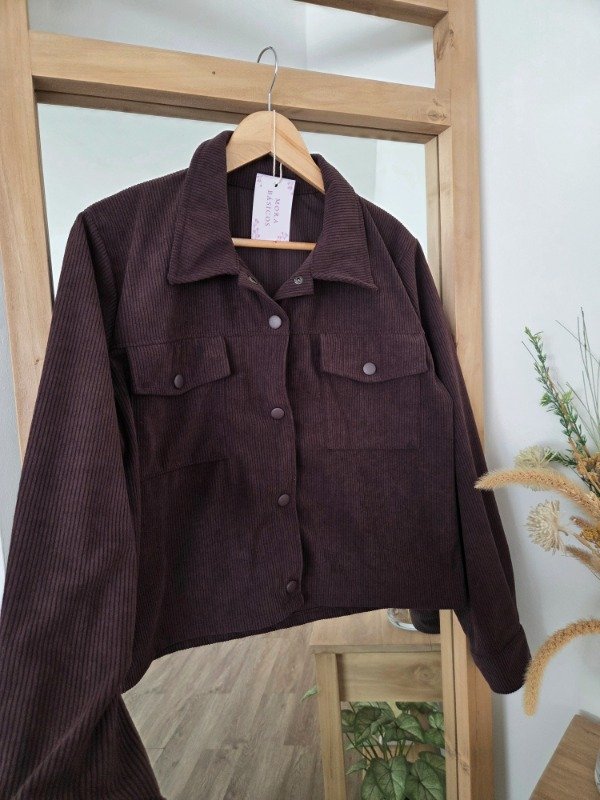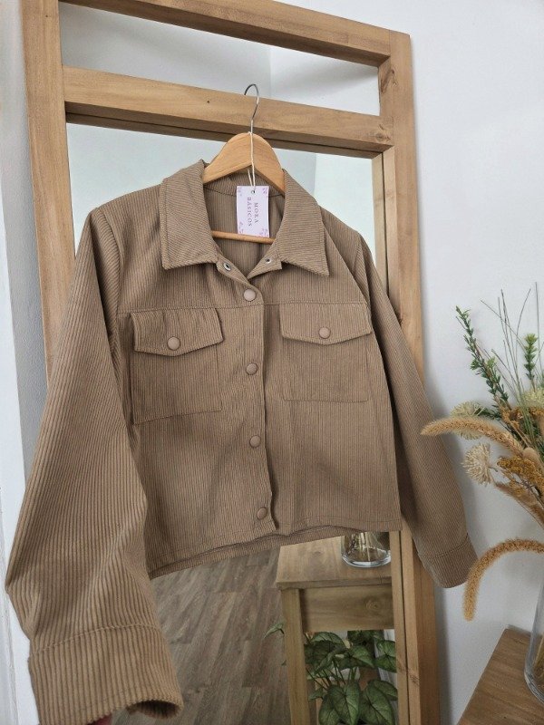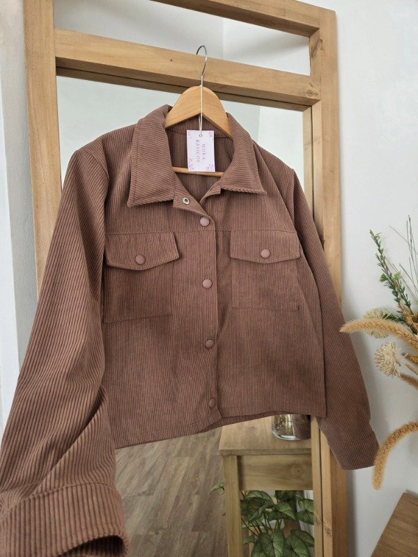 Chaqueta de corderoy de corte recto, con bolsillos delanteros y botones forrados.