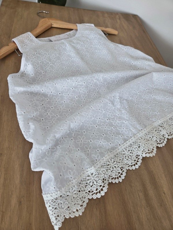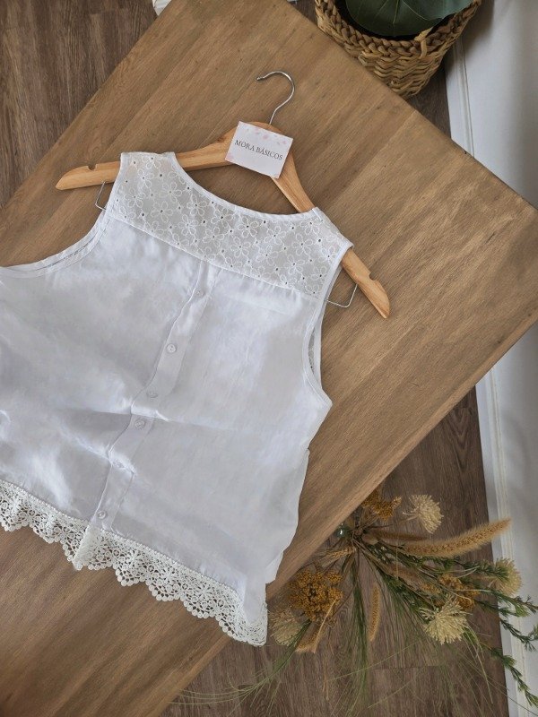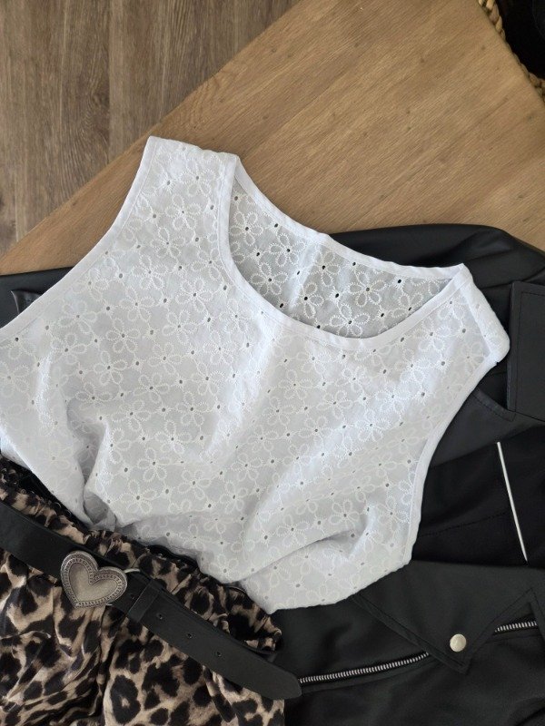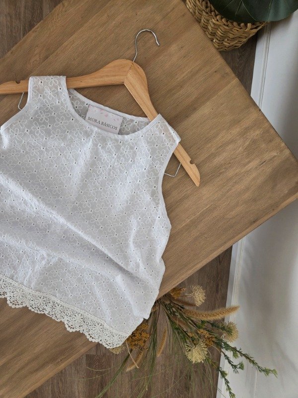 Blusa musculosa de cuello redondo de broderie floreado estampado con detalles tejidos en los bordes. Cuenta con botones para abrochar en la zona trasera.