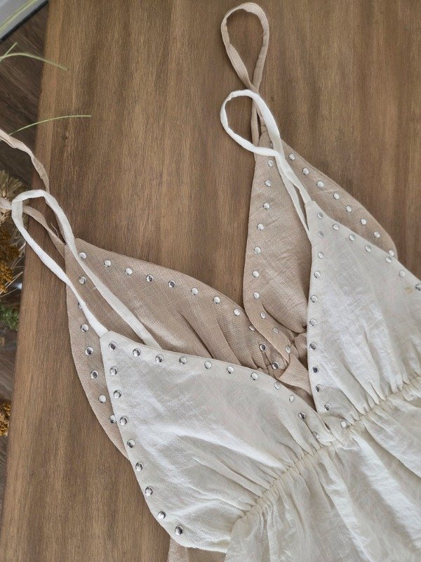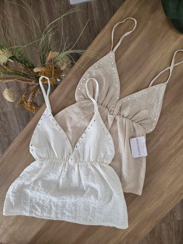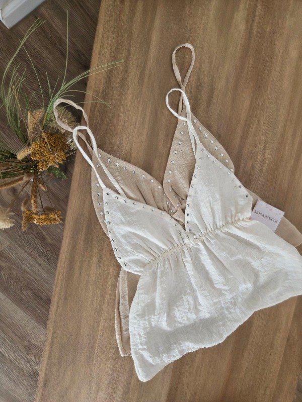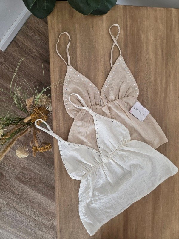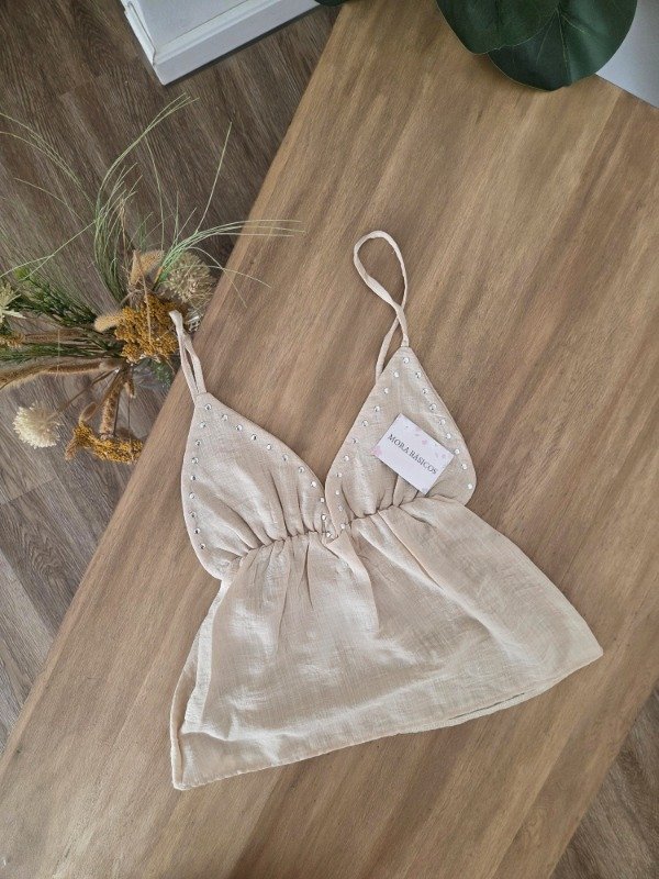 Blusa de breteles finos con escote V, customizada con tachas plateadas. Con elástico en la cintura y caída amplia. De lino.