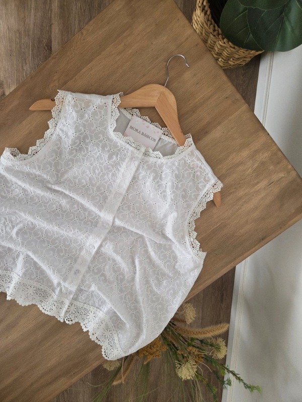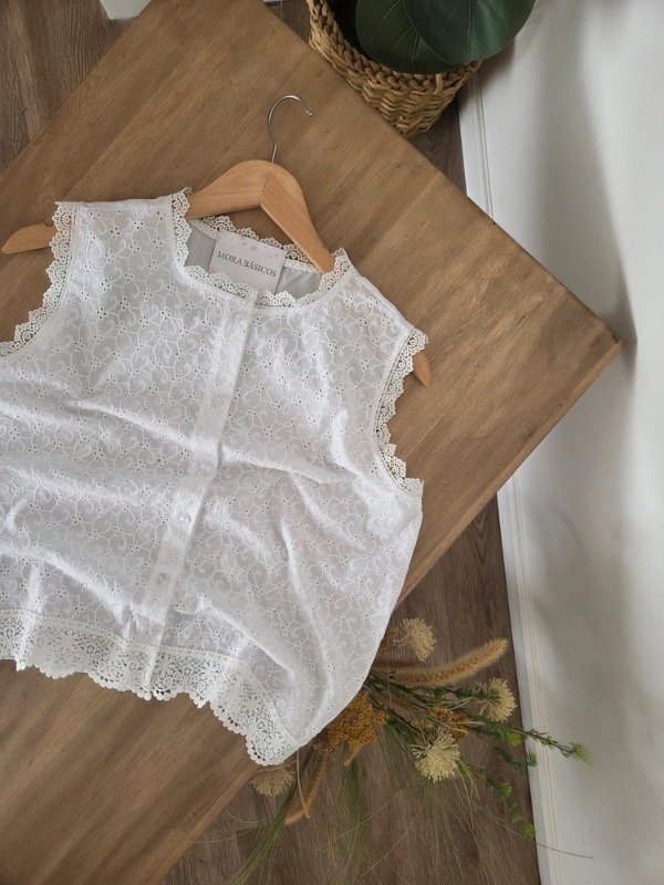 Blusa de broderie con botones frontales y detalles de puntilla en bordes.