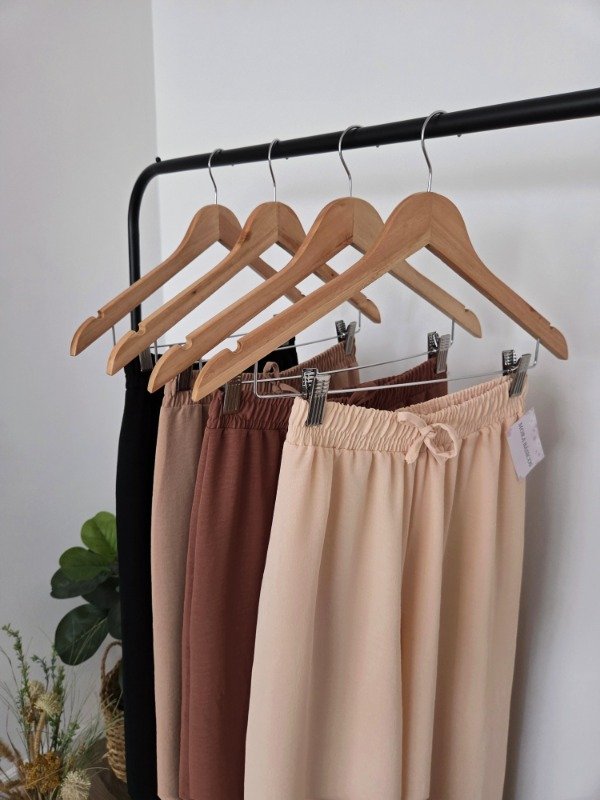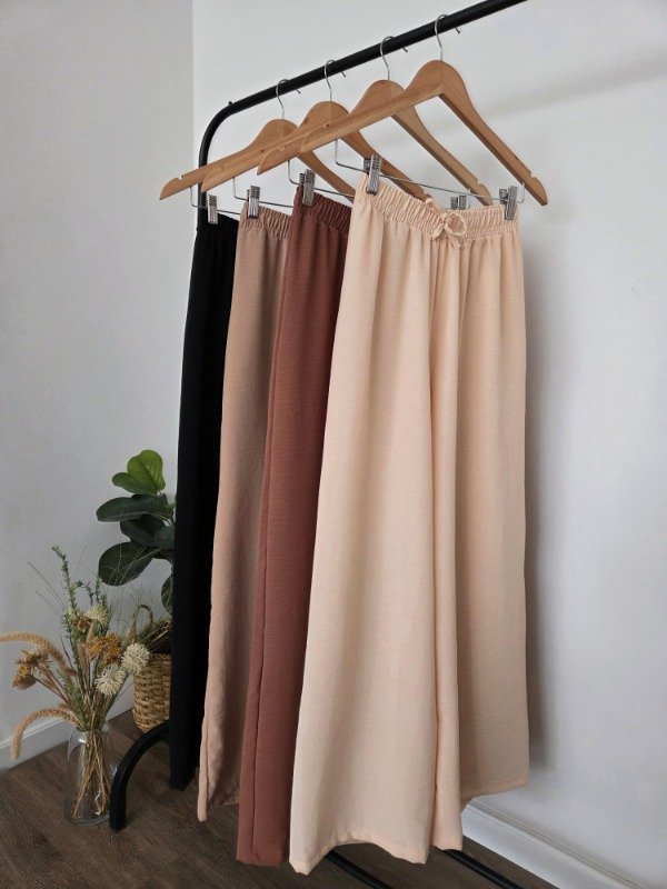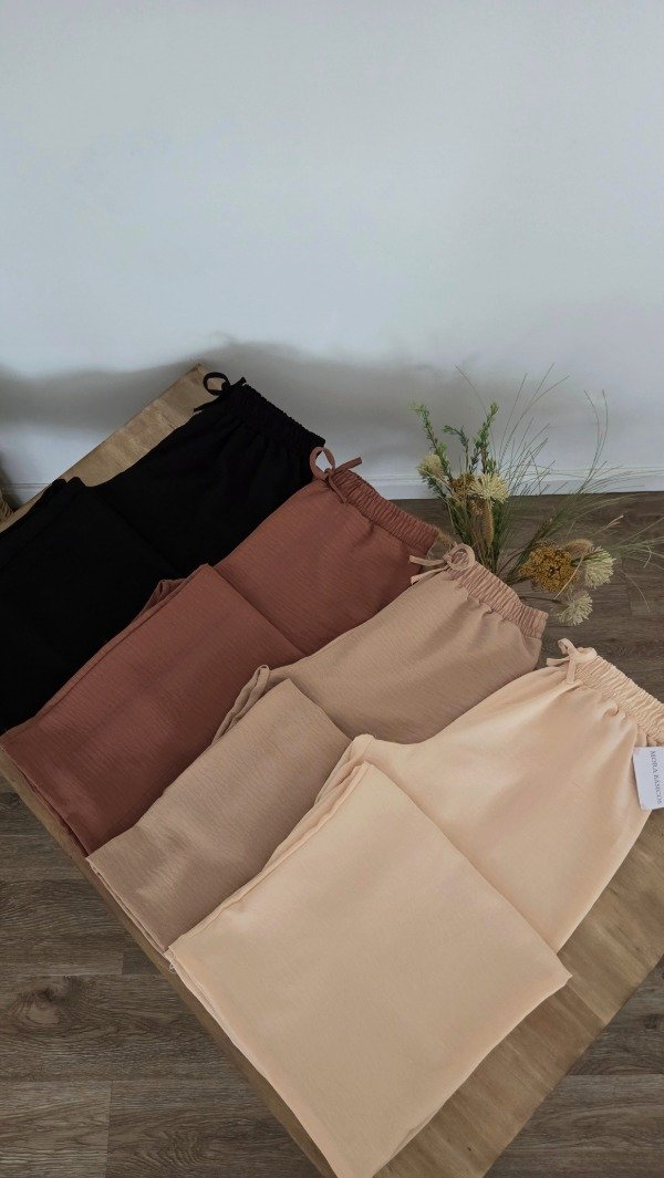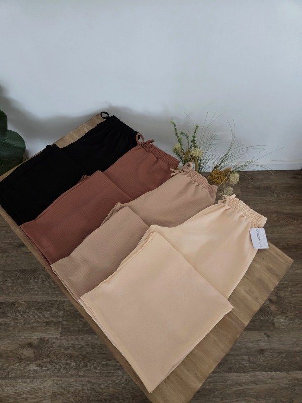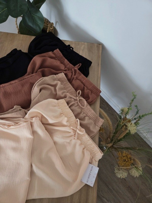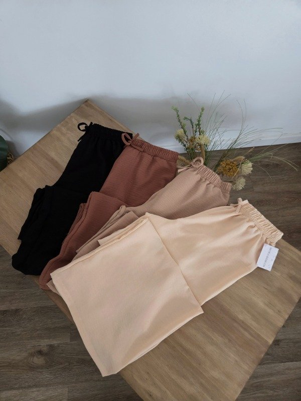 Pantalón palazzo tiro alto con cintura elástica y detalle de lazos para atar. Ideal hasta talle 44. De lino cey.