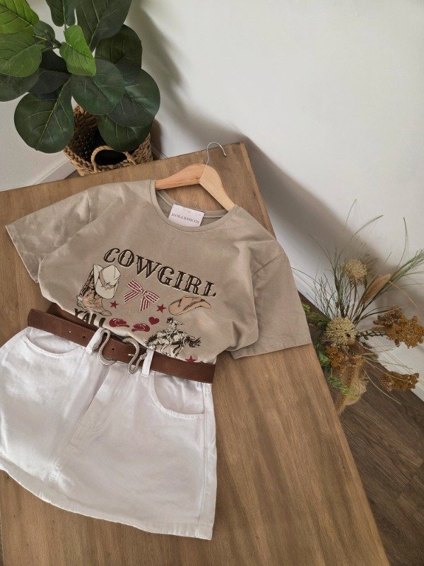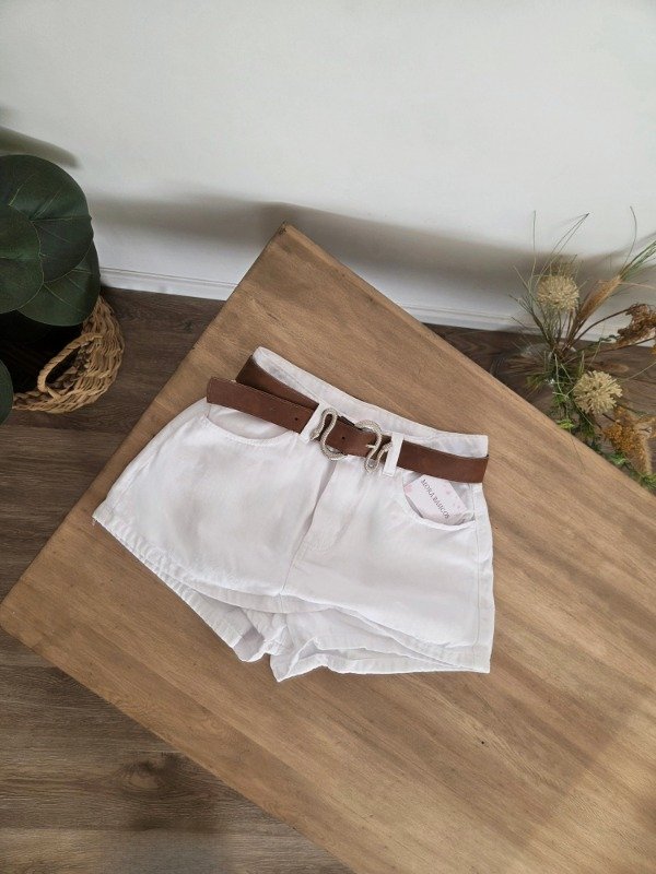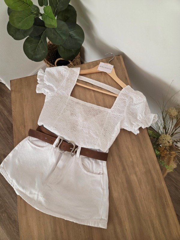 Short-pollera tiro alto de jean rígido, con bolsillos delanteros y traseros.
