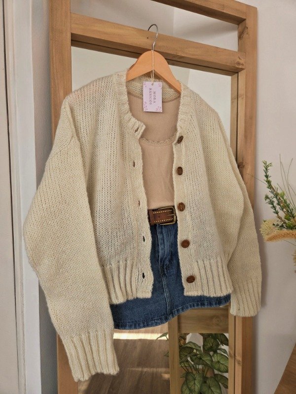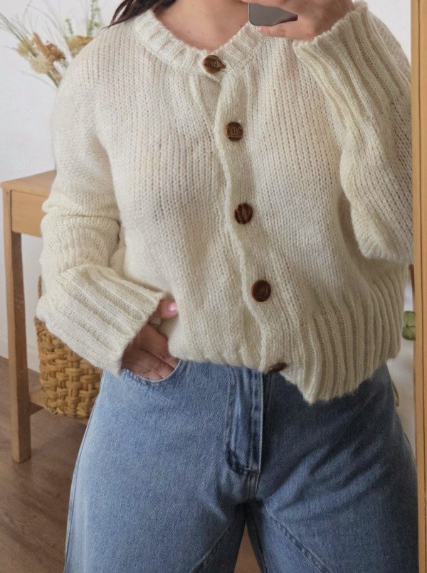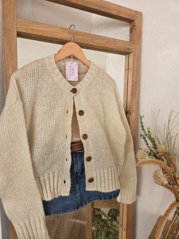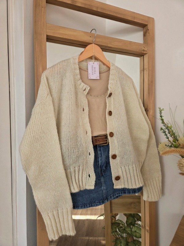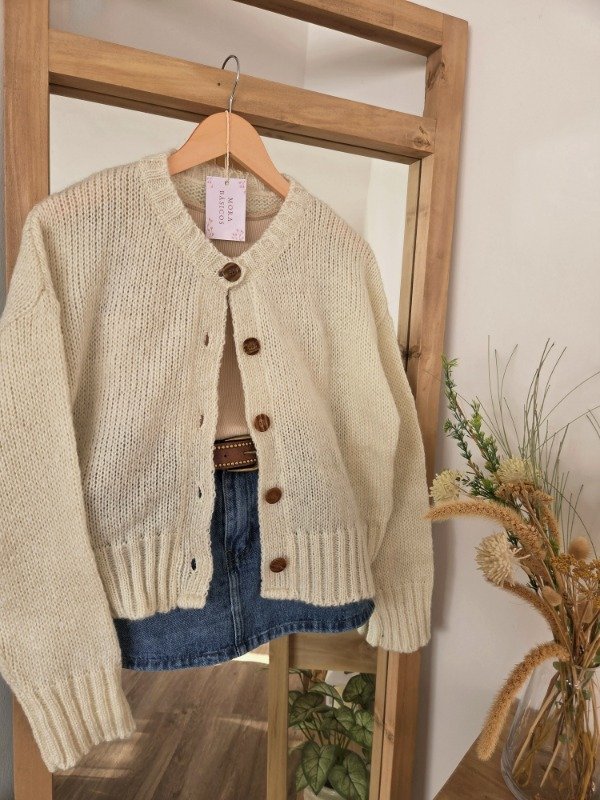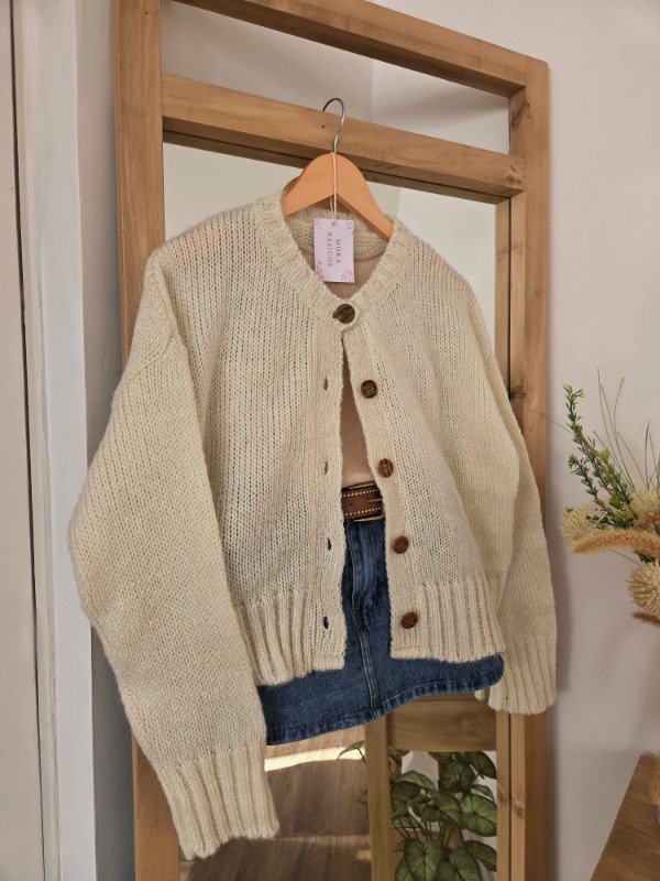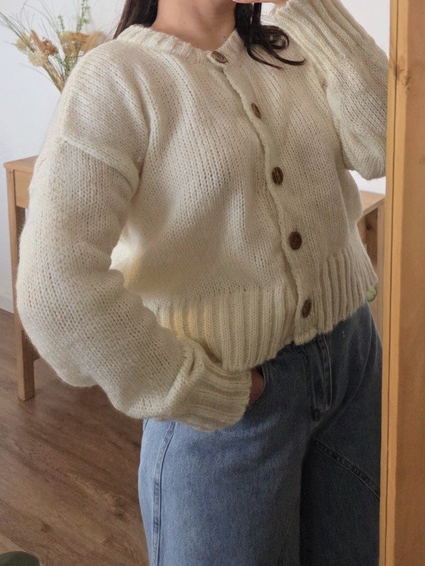 Cárdigan de lana frizz, suave y abrigado, con calce relajado y mangas amplias. Cuenta con botones al frente y terminaciones acanaladas que le dan un mejor ajuste.