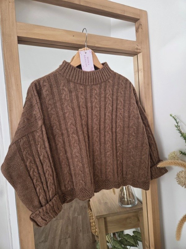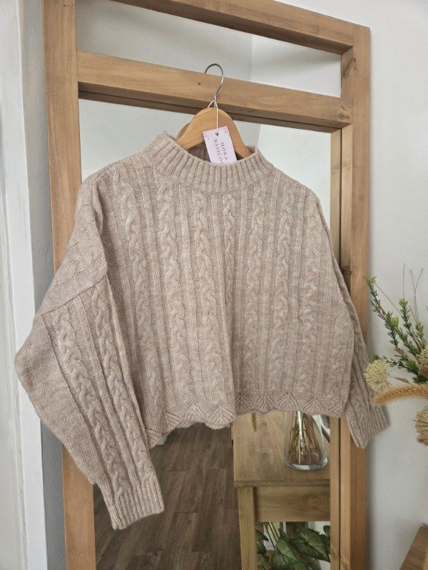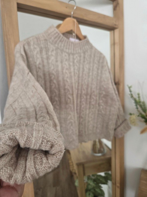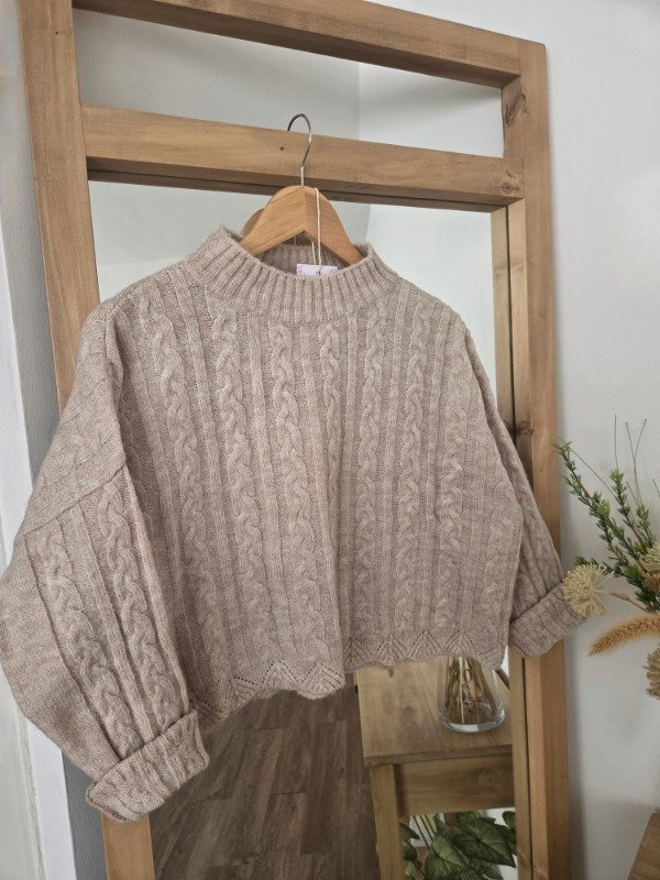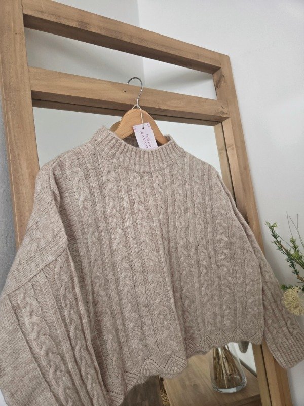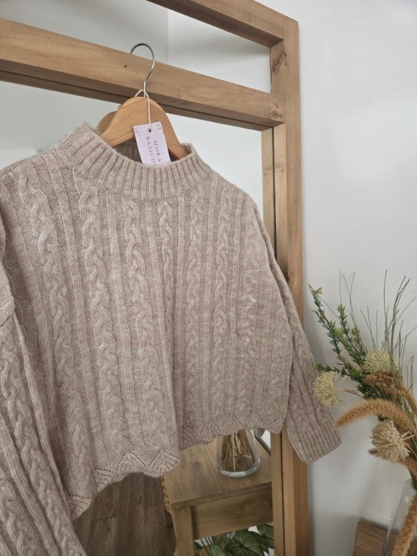 Polera tejida en lana angora con textura trenzada, de corte relajado. Tiene cuello alto cómodo.