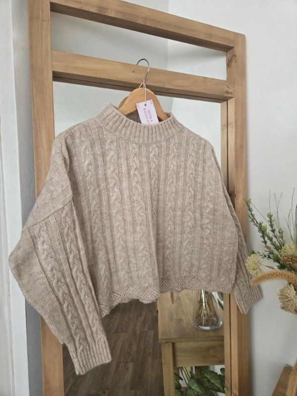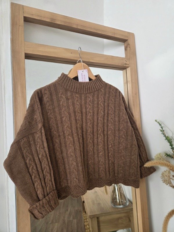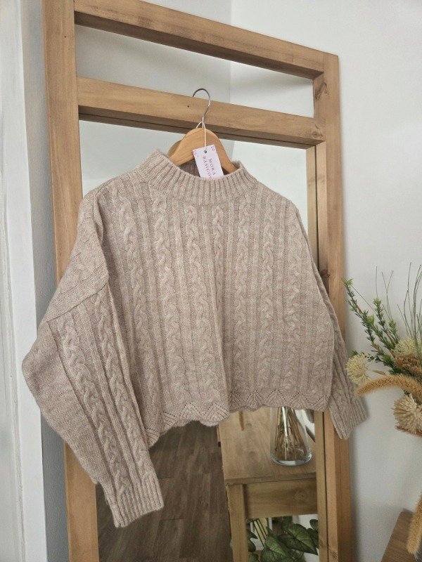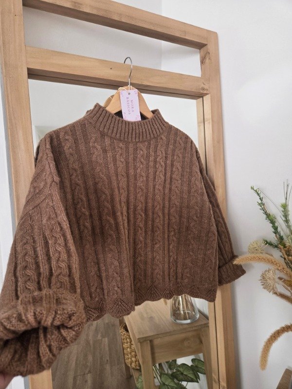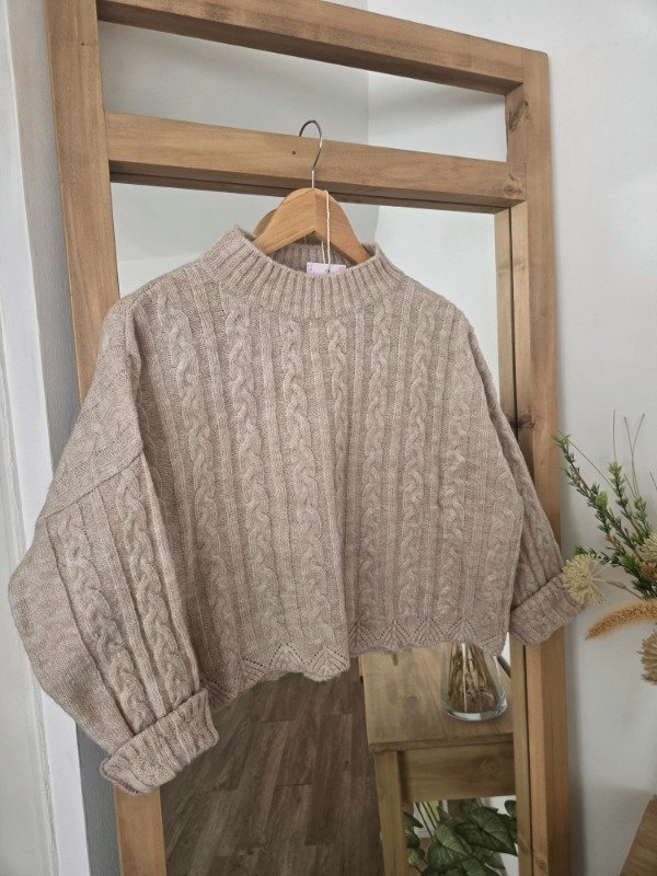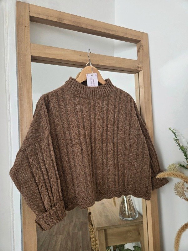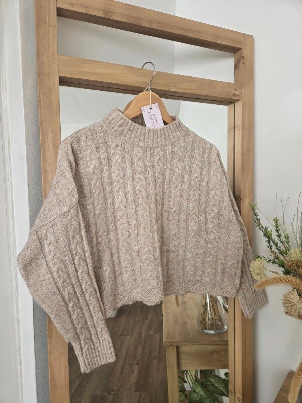 Polera tejida en lana angora con textura trenzada, de corte relajado. Tiene cuello alto cómodo.