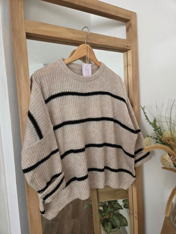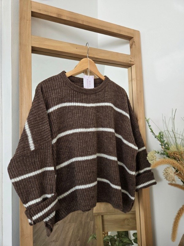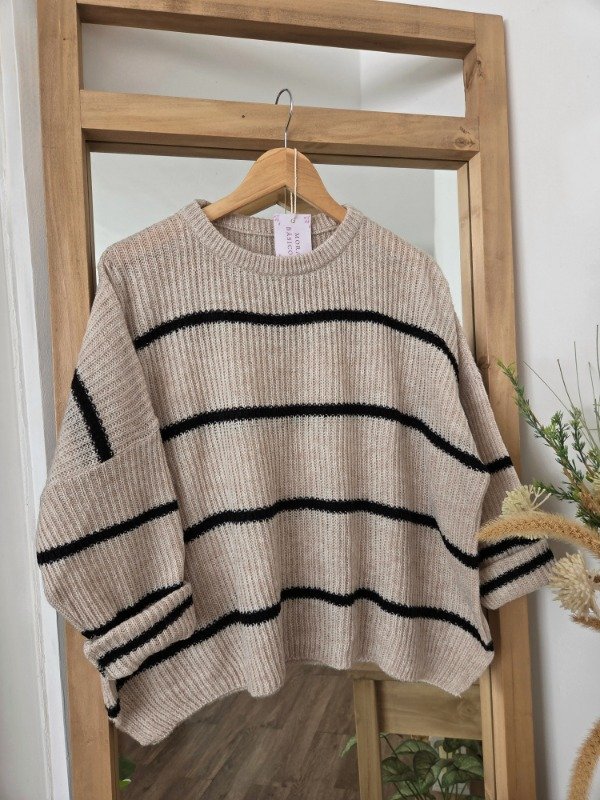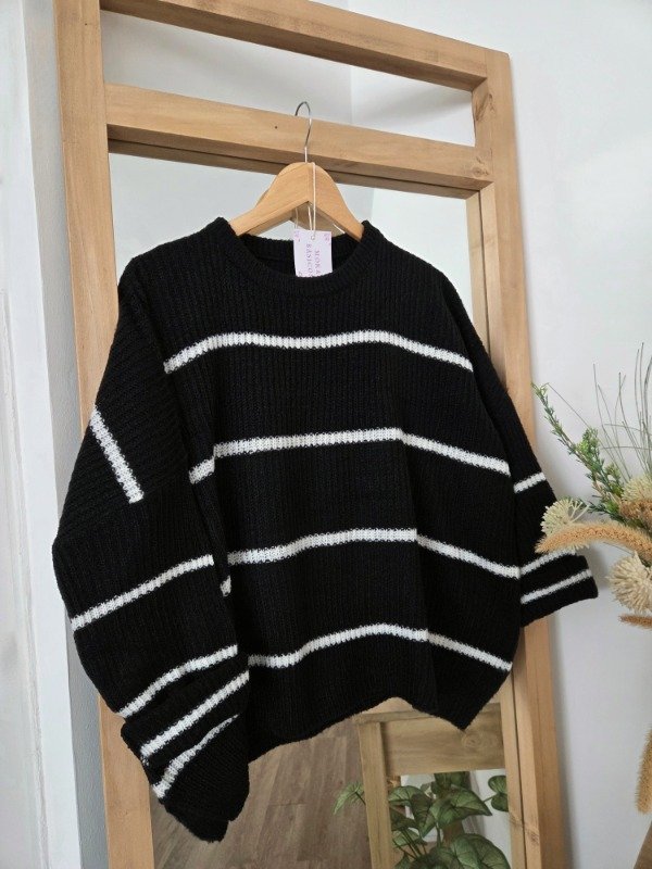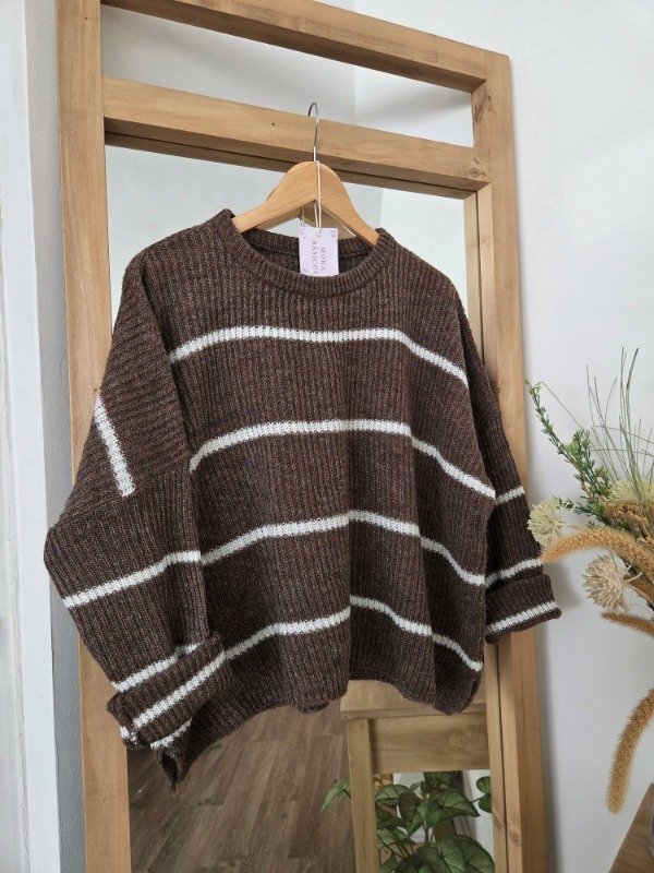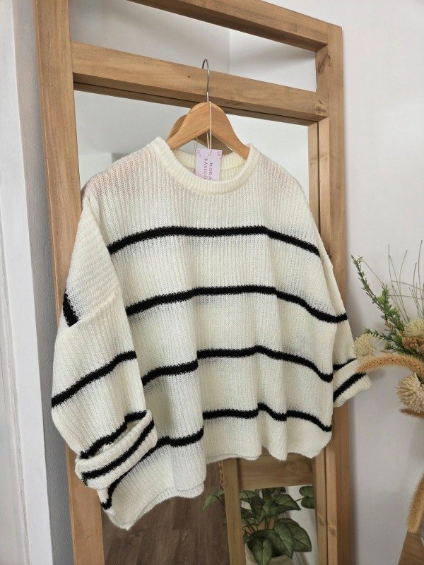 Sweater oversize tejido en hilado de algodón, suave y cómodo, con calce amplio y relajado (se adapta hasta un XL). Diseño a rayas en contraste.