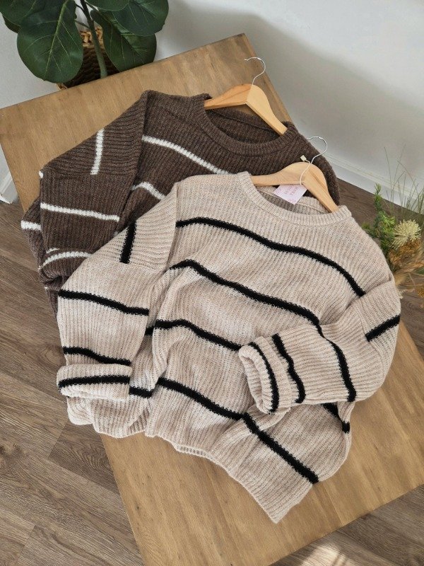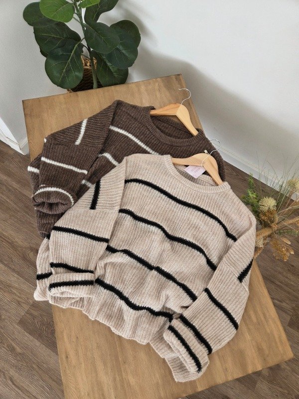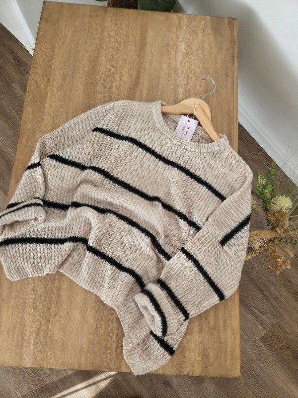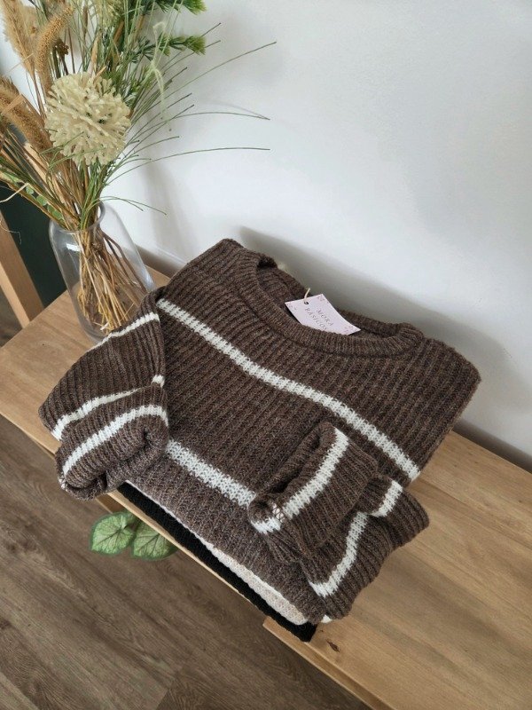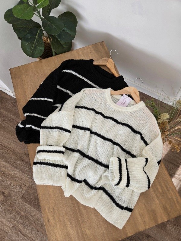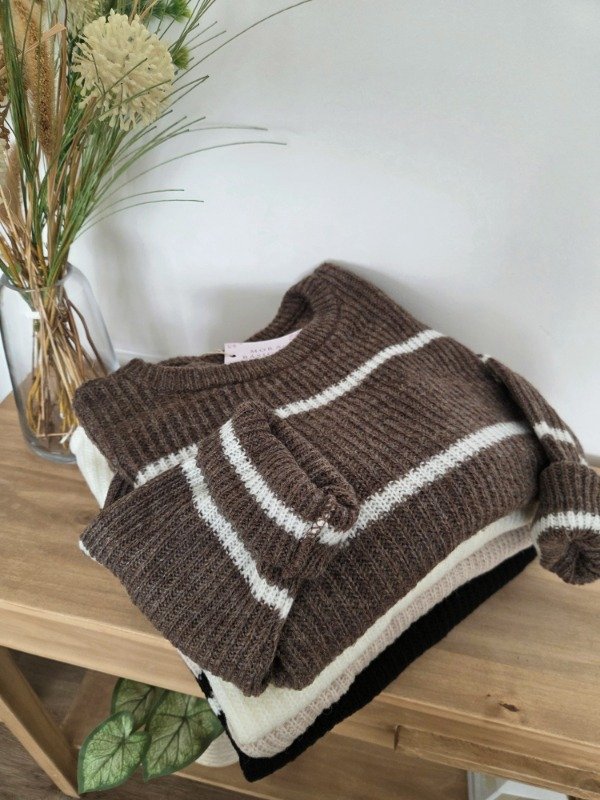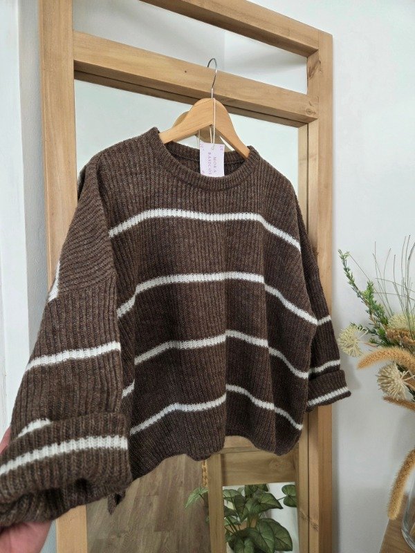 Sweater oversize tejido en hilado de algodón, suave y cómodo, con calce amplio y relajado (se adapta hasta un XL). Diseño a rayas en contraste.