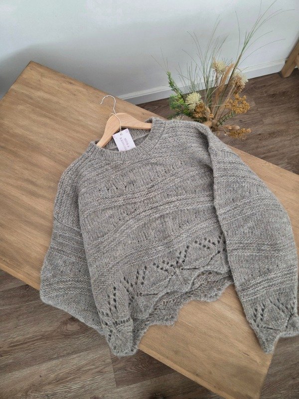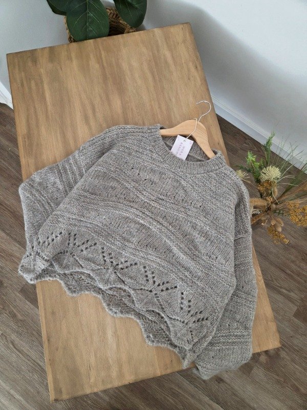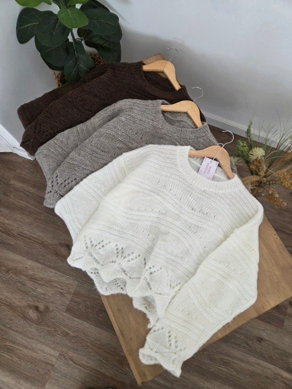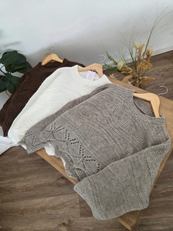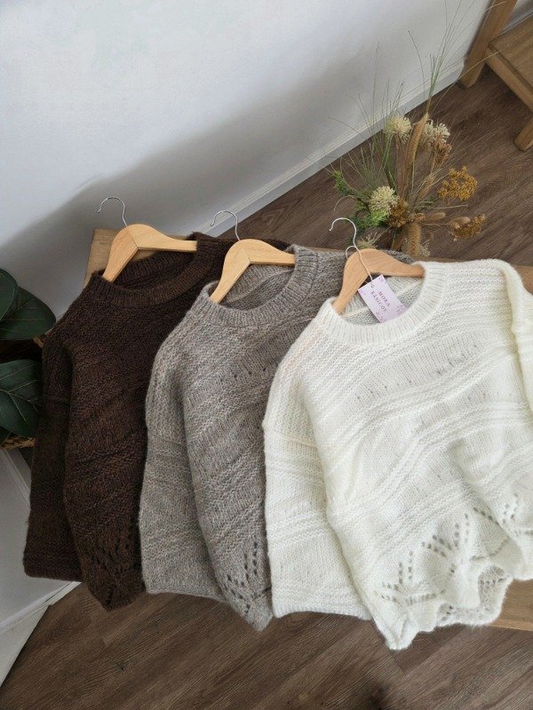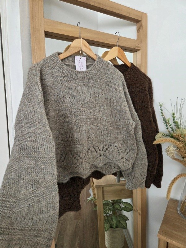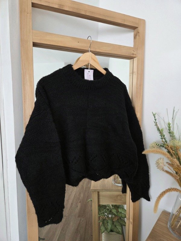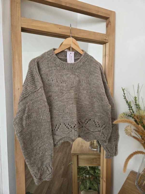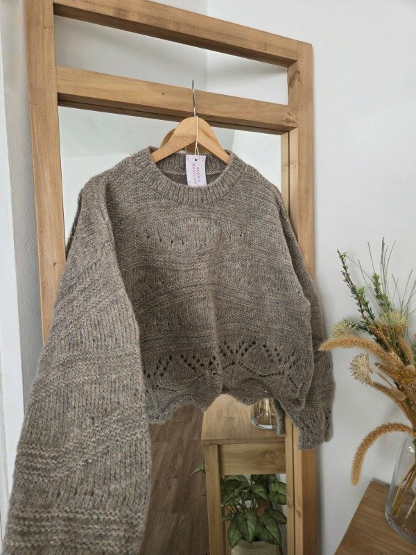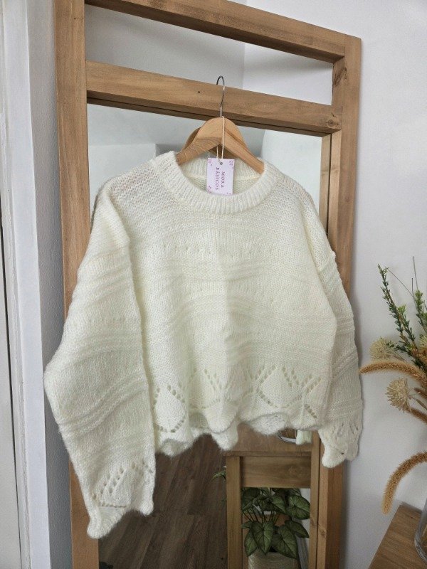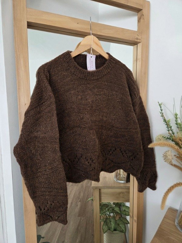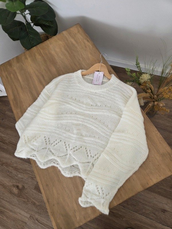 Sweater tejido de lana frizz, suave y abrigado, con calce relajado y cuello redondo. Su diseño combina texturas con detalles calados y terminación ondulada que le aporta un toque delicado.