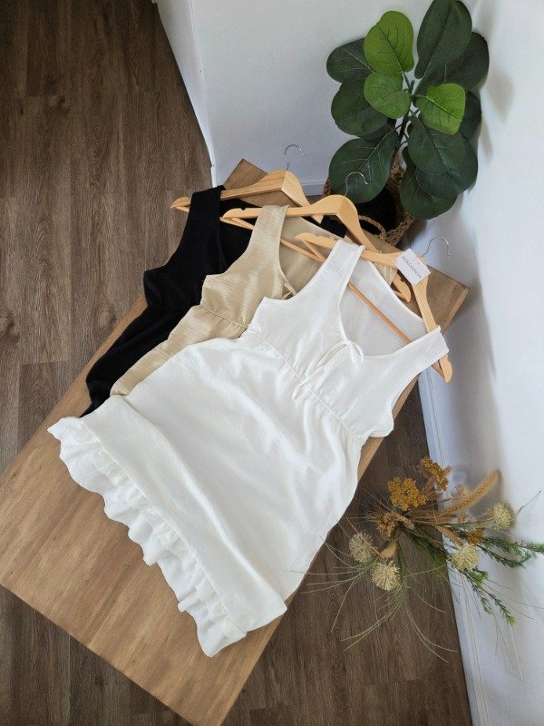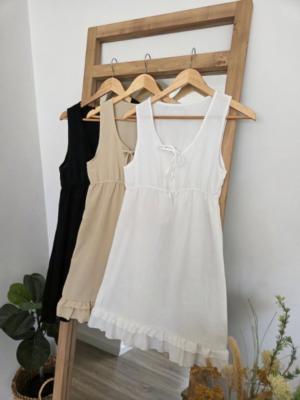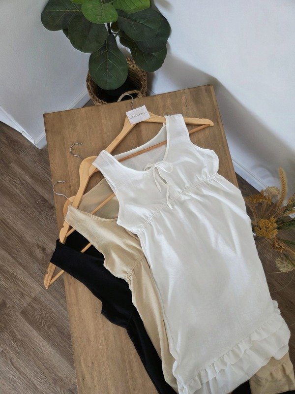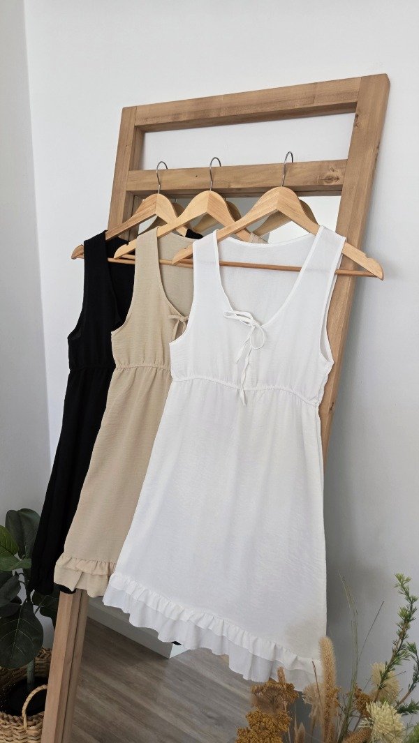 Vestido musculosa con cintura elástica y lazos para atar en el escote, con caída suelta. De bambula.